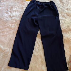 NWT Susan Graver Pants. Slacks. Size Small. Navy. Elastic Waist. Lightweight. Fabric has a sheen. 100% polyester. Inseam 27”. Rise 12”. Waist measured flat is 13” (and stretchy).