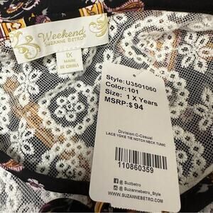 NWT Suzanne Betro Weekend Lace Yoke Tie Notch Neck Tunic Top Size 1X $94