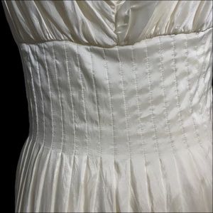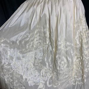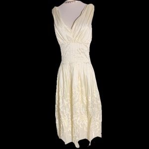 (Wedding dress, wedding attire, rehearsal dinner, wedding guest, satin, luxury, women, dress, midi, white, cream, off white, bridal shower, easter, brunch, floral, neutral, contemporary, vintage )