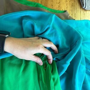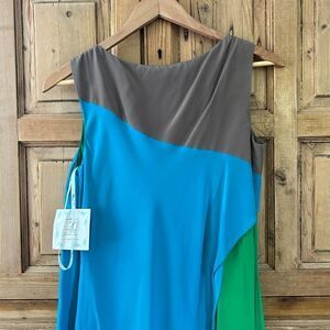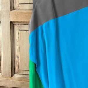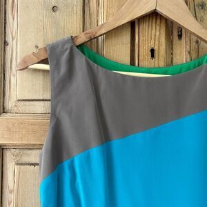 Description: Pretty little shift dress in a colorblock style featuring shades of blue, green, and gray. The dress is sleeveless and layered for a stylish look.