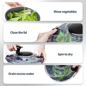 Efficient 4.2 Qt salad spinner with stainless steel bowl, BPA-free plastic parts, crank handle for easy spinning, non-slip base, and clear lid. Dishwasher safe.