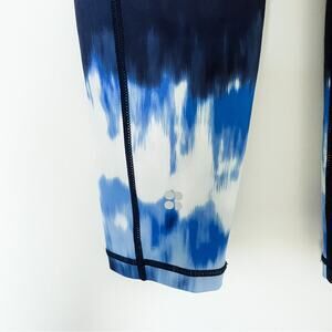 Blue with watercolor bottom, super stretchy, high waisted, full coverage