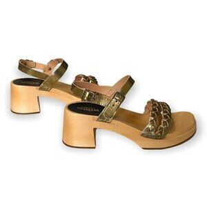 Bronze/gold leather buckled strap sling back sandal on wood clog botttom