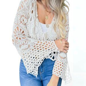Boho babe meets timeless romance in this stunning antique cream crochet cardigan. With its intricate open-knit pattern, dreamy floral details, and flowy bell sleeves, this piece is equal parts flirty, feminine, and effortlessly sexy. The delicate tie-front closure adds just the right touch of allure, making it perfect for layering over a cami, a bikini, or nothing but sun-kissed skin.