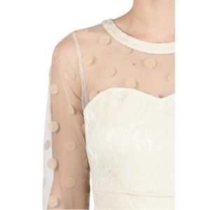 This is such a lovely dress! Polka dot mesh 3/4 sleeves, and from neckline to sweetheart bodice. Creamy beige dress has an all over brocade type rose pattern. Back zipper. Pair with nude heels or booties. Length (High Point Shoulder to Bottom): 35.5 inches. Sleeve Length: 18 inches. Size Small=2-4 (35-27-hips free), Size Medium=6-8 (37-29-hips free), Size Large=10-12 (39-31-hips free).