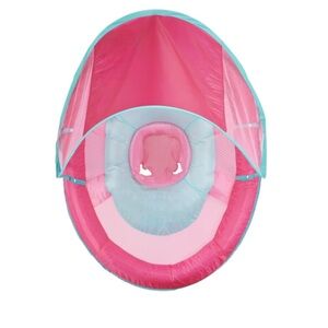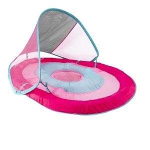 The Baby Spring Float is designed to provide a more comfortable and secure water introduction experience for your child and is the only pool float for babies with a patented inner spring around the outside edge for added stability in the water. The removable sun canopy provides shade and UPF 50+ sun protection. See-through mesh sides on the canopy help you maintain eye contact with your baby at all times, so you never miss a giggle or smile as your baby experiences this watery new world for the first time! Fabric-covered inflation adds durability and the soft mesh seat with secure leg holes provides comfort. A wide base, child safety valves, and dual air chambers enhance security. Includes a mesh play space for splashing and playing with toys. When not in use, the Baby Spring Float Sun Canopy folds flat into three compact circles, making it convenient for storage and travel. Approximate folded dimensions: 13"L x 13"W x 3"H. Approximate inflated dimensions: 34"L x 30"W x 20.5"H. Recommended for babies age 9-24 months. Includes carry tote.