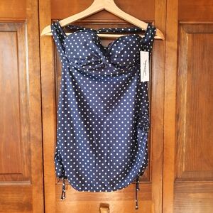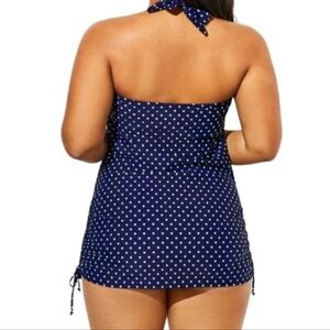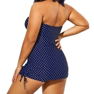 NWT Swimsuits For All Retro Navy Lime Green Polka Dot Twist Halter Top Swimsuit. Tie neck halter style swimsuit dress with sweetheart neckline, twist front chest, sewn in cups, ruched adjustable side seams, modest coverage bottoms, and longer outer skirt. In excellent condition, never worn! Tag still attached. No sanitary sticker. 82% nylon 18% spandex shell, 86% nylon 14% spandex upper lining, 100% polyester bottom lining. Size 10.