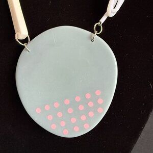 This statement necklace captures the essence of artistic creativity with its bold design and eco-friendly materials. Featuring a unique gray pendant with pink polka dots and an asymmetrical mix of white and pink accents, this handmade accessory is both stylish and sustainable. Crafted in the USA, its blend of modern aesthetics and reclaimed materials makes it a conversation-worthy piece.