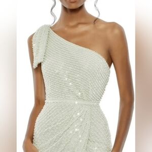 NWT Sz 10 Mac Duggal 93735 Pearl Embellished Soft Tie One Shoulder Gown