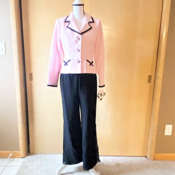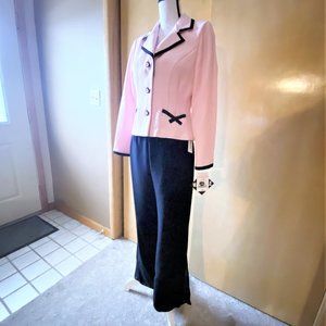 NWT Sz 10P dress pants and blazer set made for K & Company. The jacket is a tight weave in light pink with black trim. It is lined and has shoulder pads that could easily be removed. It has two front pockets and three button closures. B 38 in, W 40 in, L 22 in.