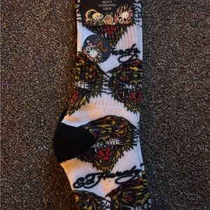 NWT Sz 6-12 Ed Hardy Men's Crew Socks - White with Black and Multicolor Tiger