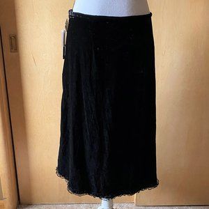 NWT Sz 8 skirt made by AKS Amy K Su. It is a light weight crushed velvet in black with a black lace trim around the bottom hem. This skirt is unlined and has a side zipper closure.