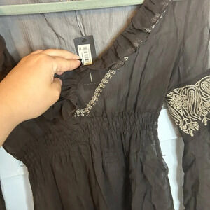 Brand new with tags. 100% silk espresso brown boho blouse with tan embroidery. This is a very sheer top. WOMENS size small.