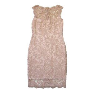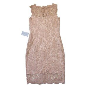 Details: * This supremely ladylike sheath puts a glam spin on cocktail attire. Fashioned from exquisite lace embroidery, the figure-flattering silhouette is fitted but not tight. Bateau neckline with sheer illusion yoke. Sleeveless. Lined with stretch jersey fabric. Center back zipper. Dry clean. By Tadashi Shoji; imported. *