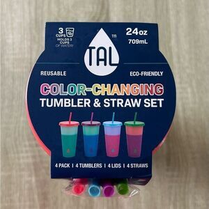 TAL Color Changing “24 fl oz” Tumblers, Multi-Color, 4 Pack changes color when you add your favorite cold beverage. There are four 24 fluid ounce multi color cups with straws and lids 💕😍💕