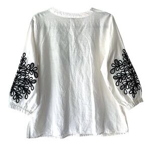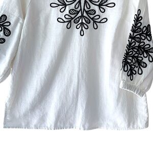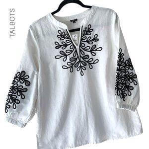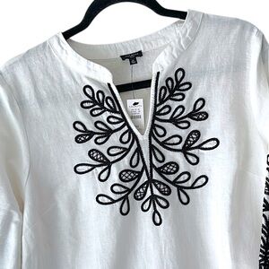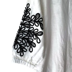 Lovely white linen and cotton split front tunic featuring a black embroidered leaf pattern on the front and sleeves from TALBOTS