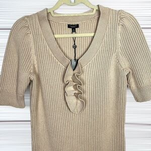 NWT TALBOTS Cotton Tan Sweater Top Rib Knit V-Neck Ruffle Details Short Sleeve M