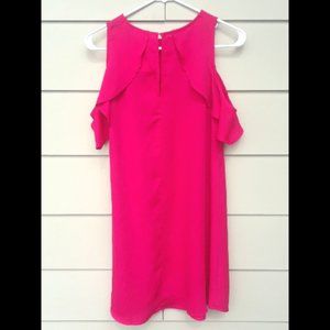 NWT TCEC Hot Pink Cold Shoulder Flutter Dress Size Small. Gorgeous flowy hot pink/fuschia mini dress with beautiful fluttery cold shoulder details. Keyhole back with button, 100% polyester. Boutique tag attached from Tiffany Lane, marked $48.