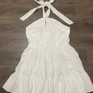 White nylon mini dress. Features halter neckline with a keyhole. Bottom is tiered and lined. Corset bodice that is smocked in the back. NWT