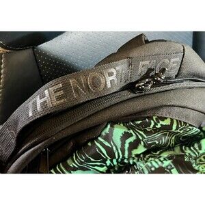 New with tags backpack by North Face. Has a green and black marbled swirl pattern with logo spellout in black. Features water bottle pockets, padded pocket for laptop or tablet, two zippered compartments and one stretch front pocket. Straps and back have padding for comfort. Great for hiking, school, work or travel.