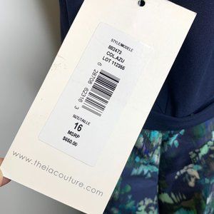 NWT THEIA COUTURE Blue Floral Silk Tea Length Gown Sz 16