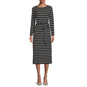 NWT Time and Tru black and white stripe belted mid length pull over long sleeve crewneck dress in a brushed jersey Haaci fabric with side slits for added style and comfort