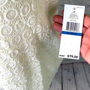 Pretty, new with tags top from Tommy Hilfiger! Antique white in color, crochet overlay over sheer front, short sleeves, cute keyhole button closure on back. Measures 23" pit to pit and 26" long.