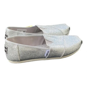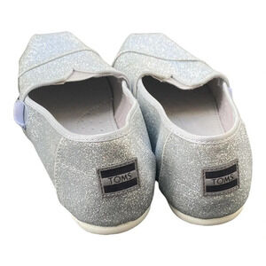 NWT TOMS Slip Ons Girls Youth US 4.5, UK 3.5 Classic Silver Iridescent Glimmer Casual Shoe. There is a light stain on the bottom of one shoe from storage. These are new with tags still attached. See pictures for condition. Super cute and eye-popping color!
