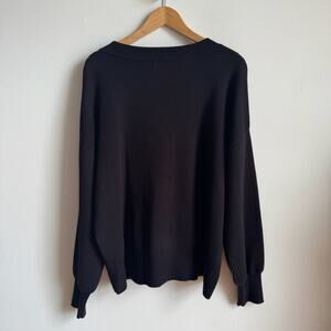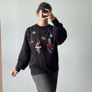 Details: This is the chicest ugly sweater you’ll find. The sweater itself is a tight black knit with sequin embellishments depicting the nutcracker and his ballerina. Wide crew neck, drop shoulder, and slightly puffed sleeves.