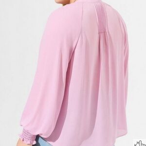Chic blouse with button-down front. Long sleeves with ruffle cuffs. Perfect for casual or dressy occasions.