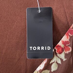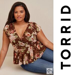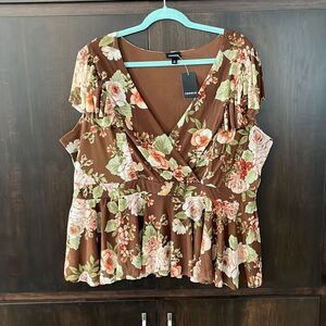 This beautiful top is made by Torrid. It’s a brown faux wrap floral print. Torrid size 3 and NWT. Smoke and pet free home.