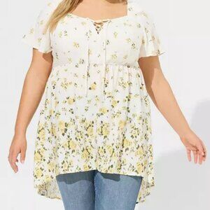 NWT TORRID Yellow White Babydoll Challis Lace Up Hi Low Top