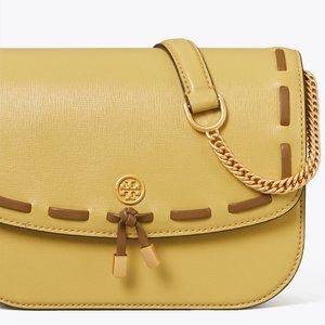 From the collection inspired by Tory's parents, Buddy and Reva Robinson, and their love of travel. Made of the highest-quality, scratch-resistant leather, with contrast stitching and an adjustable chain strap lets you wear it on the shoulder or crossbody. Timeless and versatile, for travel and everyday use.