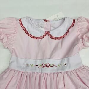 -Front button through waist with embroidered Christmas holly and ribbon...I believe this can be removed to wear the dress year around