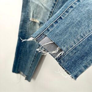 New with tags. Elevate your casual style with these women's blue distressed jeans. Perfect for a trendy, laid-back look. Manufactured distressing, and patchwork. Cotton / lycra blend. Would be cute paired with an oversized sweater or crop top. Please see photographs for measurements and details.