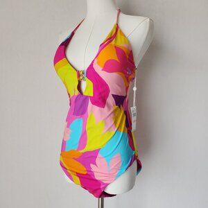 NWT TRINA TURK Lilleth Halter Plunge Multicolor One Piece Swimsuit Wireless