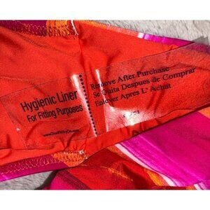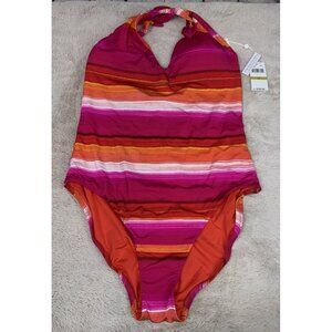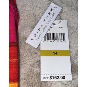 This is a NWT Trina Turk women's one-piece swimsuit in size 14. The design features a pink Solstice Stripe pattern, making it a stylish choice for beach or pool outings. This swimsuit is a fashionable option for women who appreciate quality and unique swimwear. This retails for $162.00.