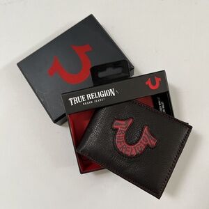 NWT TRUE RELIGION BiFold Wallet Stitched Logo Patch Leather Black Boxed Chani