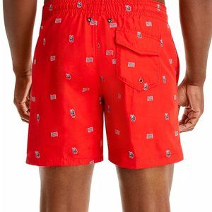 TRUNKS SURF & SWIM COMPANY RED SWIM TRUNKS WITH AMERICAN FLAGS AND PEACE SIGNS.