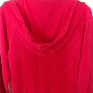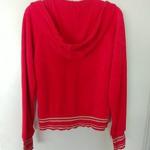 NWT RED & GOLD TWISTED HEART HODDED ZIP UP JACKET. RED VELOUR WITH GOLD ACCENTS AND LINED HOOD. SIZE L BUT FITS LIKE M.