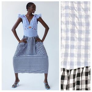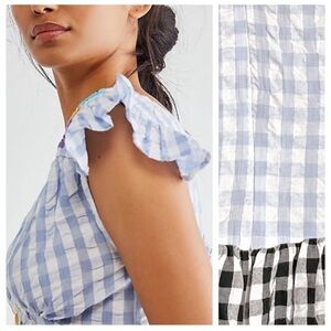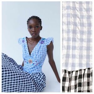 Hand embroidered flowers on gingham plaid pattern throughout. Fluttered sleeves with ruffles detail. V-neck. Empire waist. White, Purple, Yellow, Green, Pink.