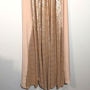 This limited edition gown is a size in a gorgeous champagne cream pink, with the softest lining fabric. As with luxury, even the sequins are soft and simple, but scratchy and stiff.