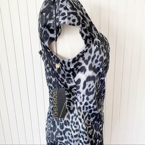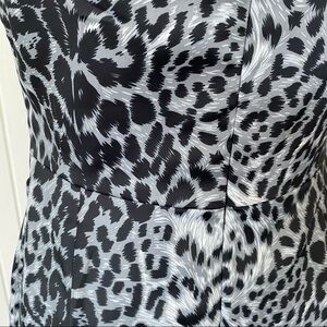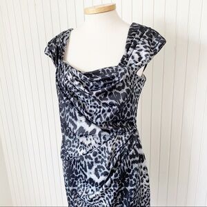 NWT Tadashi Shoji grey (gray), black & white animal print cocktail dress. Cap sleeves. Thick satin-like material. Rouching on top and sides for a flattering look. Does have a little give/stretch to the material. Sort of a square neckline. Fully lined. Back zipper. Sexy and classic! Great for an event or a night out.