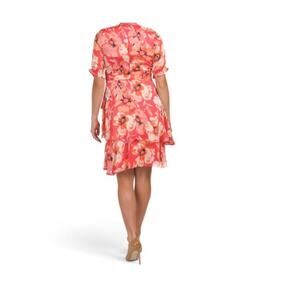 This stunning Tahari ASL dress features a beautiful floral print, elegant pleats, and a charming ruffle detail. The faux wrap design flatters the figure, while the tie waist accentuates your curves. Perfect for any special occasion or a stylish day out!