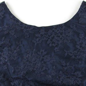 Gorgeous sleeveless dress is very dark navy. (A couple of the photos have been lightened a bit so you can see the detail.) It has a full navy blue lace overlay with a subtle shimmer to it. Matching 1-3/4" wide lace belt/sash. Gently rounded neckline in front; dropped drape neckline in the back. (open part goes about halfway down the back) Hidden side seam zipper. Full lining underneath.