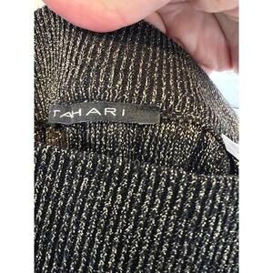 The NWT Tahari Black Shimmer Metallic Pleated Midi Skirt in size M is a stylish and eye-catching piece of women's clothing. The skirt features a flattering pleated design and falls to a midi length, making it versatile for both casual and dressy occasions. The metallic Black color adds a touch of glam, perfect for adding some sparkle to your outfit. Made by the reputable brand Tahari, this skirt is sure to be both quality and fashionable, making it a valuable addition to any woman's wardrobe.