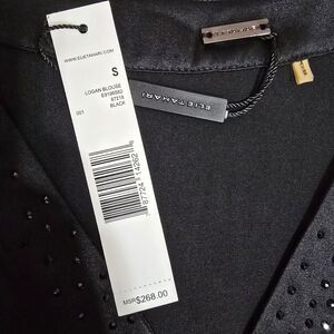 This beautiful Elie Tahari Blouse is made out of a Silk Blend material and comes in a Black color / Solid pattern. Styling includes a relaxed fit with V-neck and crystal accents. Dropped shoulders with split kimono style sleeves. Asymmetrical hem with side vents. Truly a gorgeous Elie Tahari blouse guaranteed to make an excellent addition to your wardrobe!