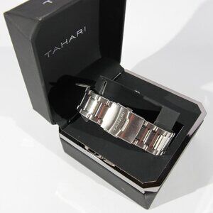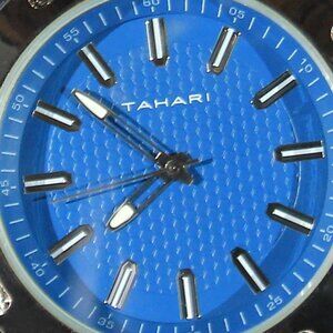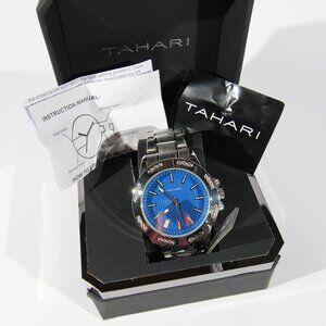 Tahari men's silver and blue watch. The watch features a blue dial with a metal rope going around the outside of the watch face. The watch bezel has decorative elements, and it has a metal link bracelet