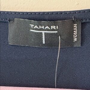 Chic midnight blue top by Tahari. Features a sophisticated design.