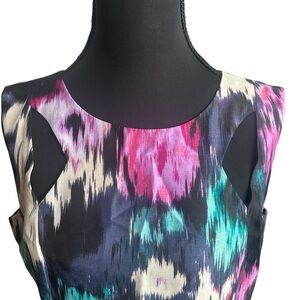 Chic and colorful midi dress by Tahari. Features a bold pattern with pink, blue, and black tones. Perfect for a stylish look and has fun cut outs at collarbone and back. It is NWT and a size 6P.